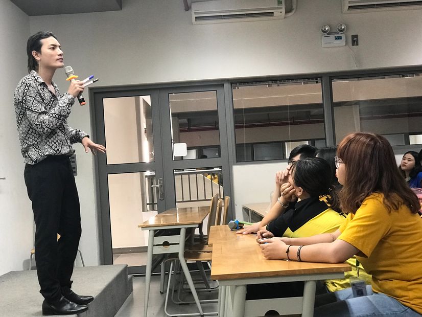 Chàng lớp trưởng pr15 giới thiệu Phong lên và bắt đầu buổi giao lưu về kỹ năng nói chuyện trước Công chúng.